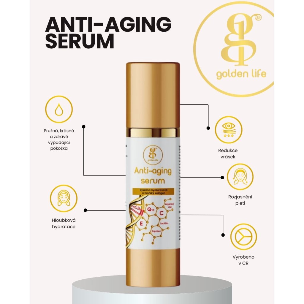 Extra silná účinná séra s obsahem přírodních aktivních látek speciálně navržených pro redukci vrásek. Tato kombinace zlepšuje hydrataci pleti, redukuje jemné i hluboké vrásky, zlepšuje elasticitu, napomáhá regeneraci pleti po zákrocích a celkově projasňuje pleť. Pravidelná aplikace pleťových sér s mořským bioaktivním kolagenem, kyselinou hyaluronovou, koenzymem Q10, peptidy a dalšími účinnými látkami jako squalan a arganový olej redukuje vrásky a vyhlazuje a omlazuje pleť.