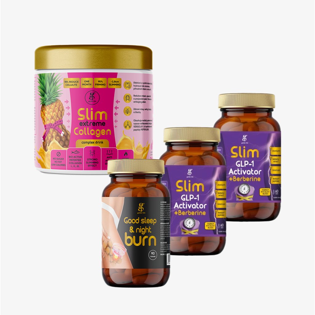 Čtyři produkty, které se dokonale doplňují a společně pomáhají tělu hubnout přirozeně a efektivně. Slim GLP-1 Activator omezuje chutě, stabilizuje hladinu cukru v krvi a podporuje spalování tuků a v balíčku jej máte hned 2x! Slim Extreme Collagen s obsahem Garcinie cambogia kombinuje sílu kolagenu, přírodních enzymů a spalovacích složek pro krásnou pokožku i štíhlejší postavu.Sleep & Night Burn zase pomáhá zvládat večerní hlad, zklidňuje tělo a urychluje noční spalování. Společně tvoří vyvážený systém, který tělu pomáhá hubnout přirozeně, udržitelně a bez zbytečného stresu. Podívejte se na jednotlivé produkty: