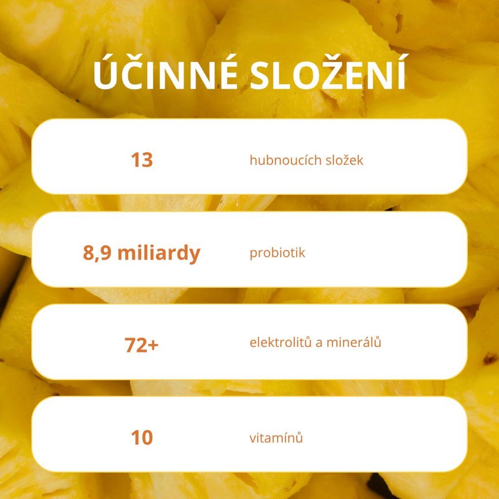 Two powerful enzymes from pineapple and papaya. They help break down proteins and fats, thereby facilitating digestion and contributing to natural metabolism acceleration. They also support muscle regeneration after physical activity and reduce bloating. They bring lightness and comfort even with a regular diet.