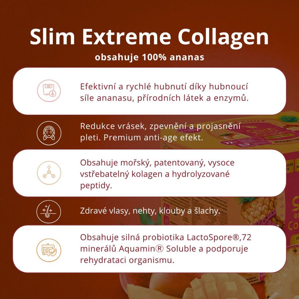 Slim Extreme Collagen Mango is not just about weight loss and beauty, but also about overall vitality. Thanks to 72+ vitamins and minerals Aquamin® Soluble, it supplements the body with what is often missing during diets and stress, thus supporting proper muscle and nervous system function. 8.9 billion LactoSpore® probiotics take care of healthy intestinal microflora, improve digestion and nutrient absorption.