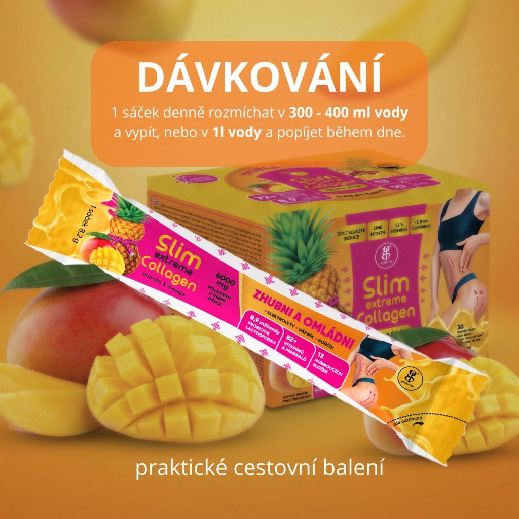 Slim Extreme Collagen Mango is a refreshing drink that combines the power of marine collagen, tropical fruit and patented active ingredients for a slim figure, hormonal balance and beauty.