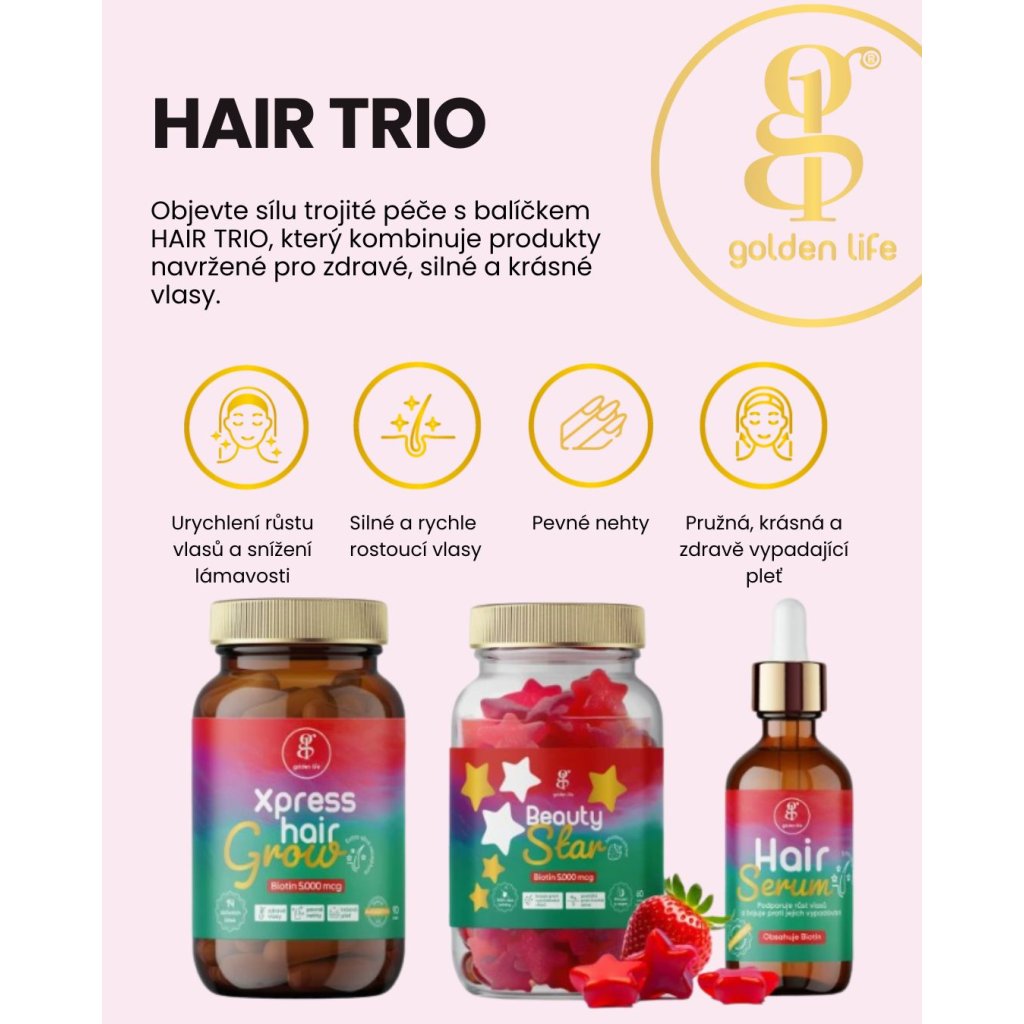 Xpress Hair Grow je unikátní komplex aktivních látek, který eliminuje lámavost vlasů, podporuje jejich růst, zahuštění, posílení a výživu. Pomáhá předcházet nadměrnému vypadávání vlasů a řídnutí, podporuje tvorbu keratinu a zlepšuje zdraví vlasů, řas, obočí a nehtů. Díky vysokému obsahu aminokyselin a biotinu přispívá k regeneraci organismu, zpomaluje stárnutí a podporuje zdraví pleti. Ideální při trichologické léčbě.